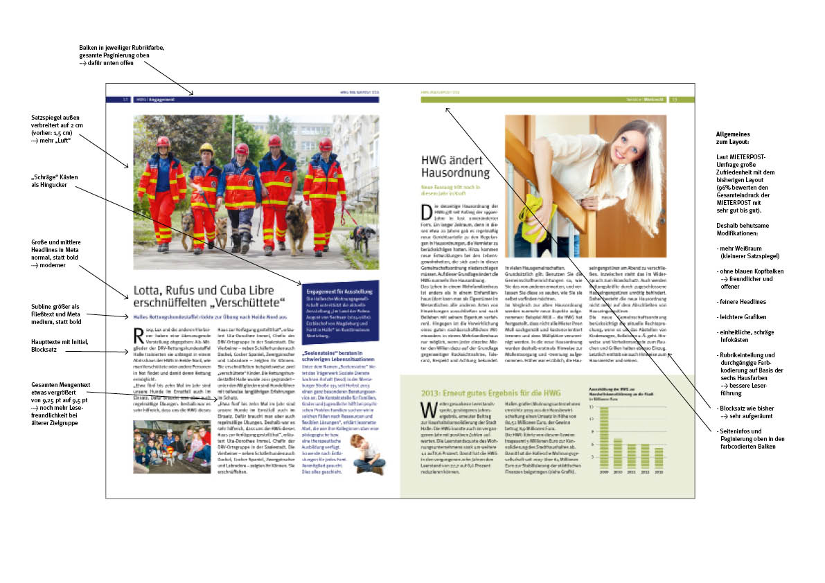 Dezember 2014 Seit vielen Jahren gestalten wir für die Hallesche Wohnungsgesellschaft mbH die Mieterzeitung "Mieterpost". Der Kunde wünschte sich in einer Ausschreibung ein Redesign des Magazins. Diese Ausschreibung konnten wir erneut mit unseren Entwürfen und neuen Layouts für uns gewinnen. Vier Ausgaben der "Mieterpost" sind für das Jahr 2015 geplant, jeweils 24 Seiten im DIN A4-Format.