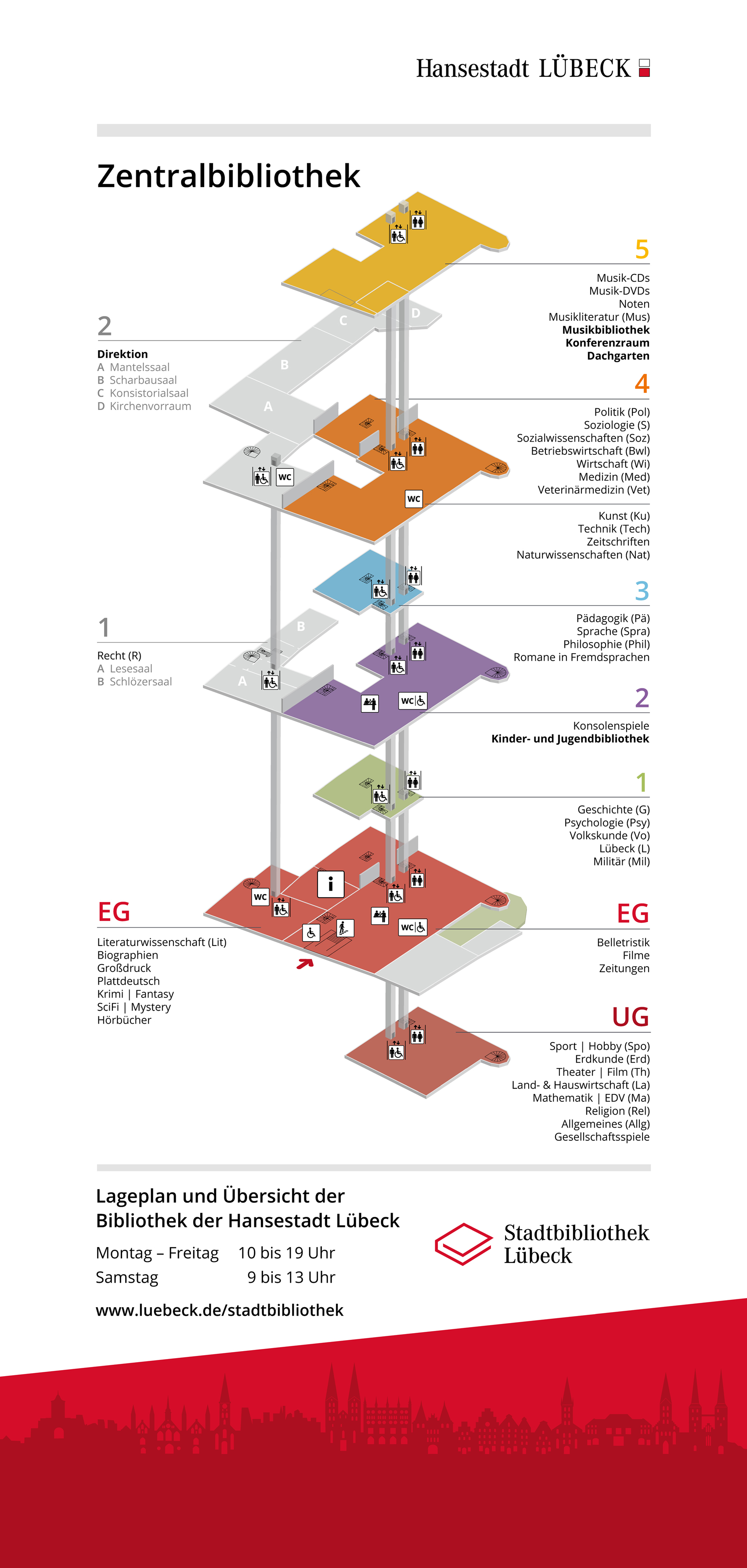 Kampagne und Wegeleitsystem für die Zentralbibliothek der Hansestadt Lübeck. Hierzu schreibt HL-Live: »Die in Kürze geplante Erneuerung der Fahrstühle in der Zentralbibliothek ermöglicht die Neugestaltung der räumlichen Darstellung. Auf den neuen Plänen ist nun die gesamte Zentralbibliothek abgebildet. Kein einfaches Unterfangen bei dem vorhandenen Gebäudeensemble aus den verschiedenen Jahrhunderten. Die Stockwerknummerierung ist nun DIN konform, die frühere Aufteilung nach „Altbau“ und dem 50 Jahre alten „Neubau“ musste erneuert werden.«